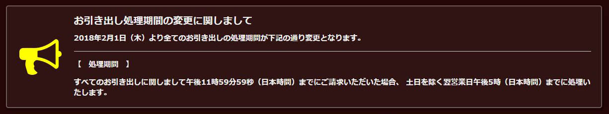 ”お引き出し処理期間の変更に関しまして 2018年2月1日(木)より全てのお引き出しの処理期間が下記の通り変更となります。 —————————————————————————————————————————————————– 【 処理期間 】 すべてのお引き出しに関しまして午後11時59分59秒(日本時間)までにご請求いただいた場合、 土日を除く翌営業日午後5時(日本時間)までに処理いたします。”