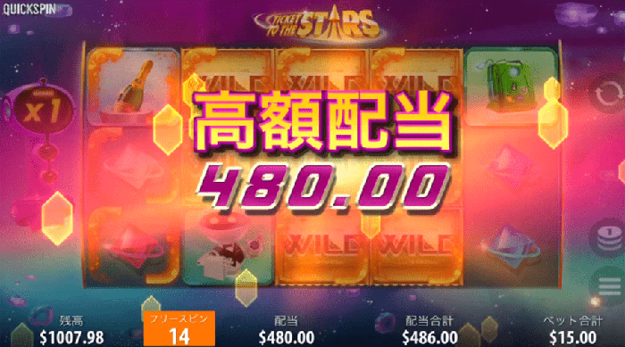 スピン14回目に連鎖コンボで高額配当480ドル!