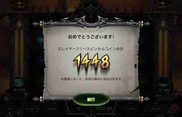 スレイヤーフリースピンの結果は$337とな?