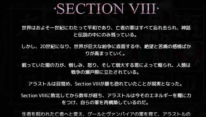 「秘密組織セクション・エイトにやられたアラストルって亡者の王様が数年で蘇って、グールとヴァンパイアの軍勢を作ろうとしている。新たな戦いが始まる」って感じ。