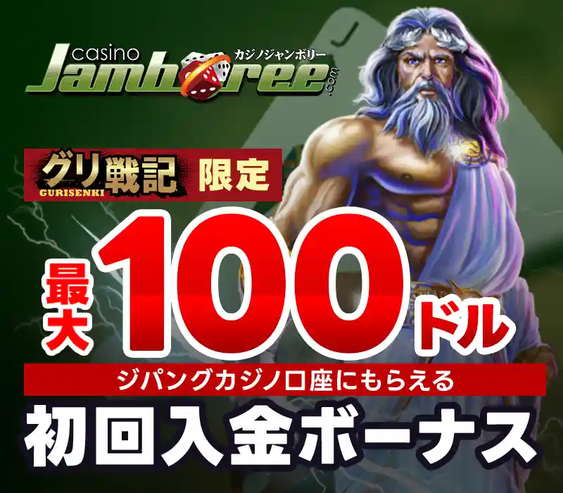 ですが、ご安心ください!入金不要ボーナスと同じくらいお得なグリ戦記専用ボーナスが用意されています!当サイトのリンク・バナー経由でカジノジャンボリーに新規登録と初回入金をしてくれた方限定で、姉妹ブランド・ジパングカジノの口座に初回入金ボーナス最高$100が進呈されます。それでは詳しい内容を紹介していきます。