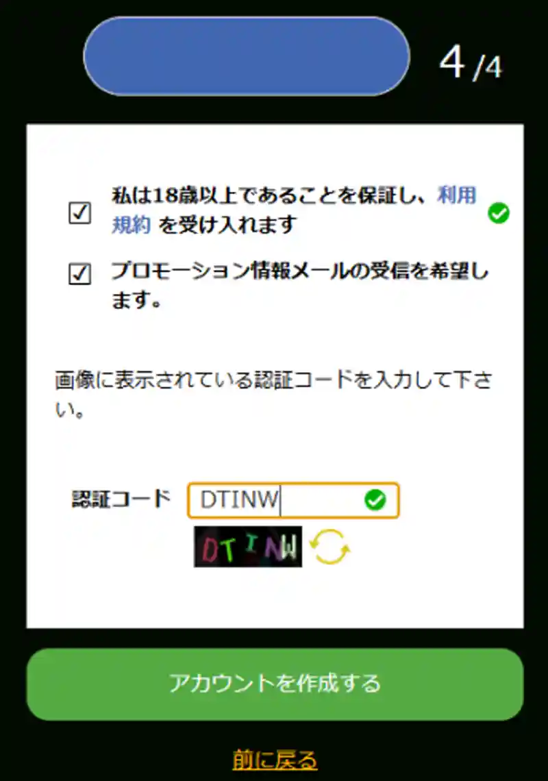 利用規約にチェックマークを付け、画像で表示されている認証コードを入力したらアカウント作成完了です。