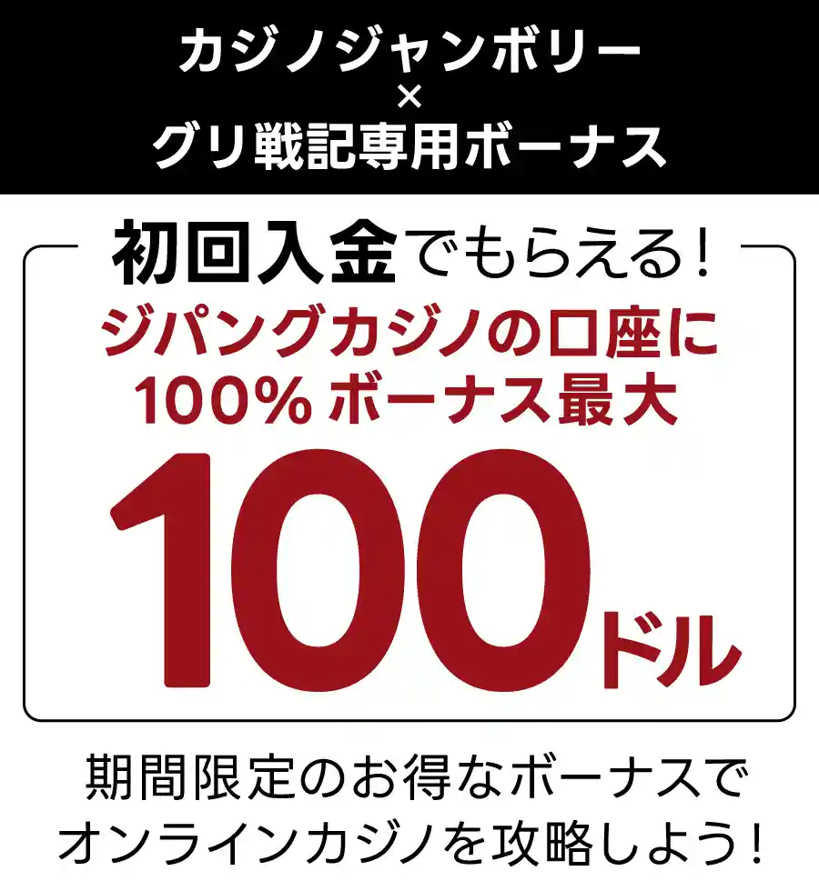 ですが、ご安心ください!入金不要ボーナスと同じくらいお得なグリ戦記専用ボーナスが用意されています!当サイトのリンク・バナー経由でカジノジャンボリーに新規登録と初回入金をしてくれた方限定で、姉妹ブランド・ジパングカジノの口座に初回入金ボーナス最高$100が進呈されます。それでは詳しい内容を紹介していきます。