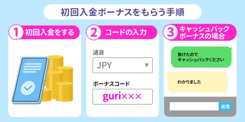 ボーナスコードを利用する場合は、オンラインカジノ内のボーナスコード入力欄に入力すれば受け取りが可能です。また、チャットサポートに連絡すると貰える初回入金ボーナスも存在します。
