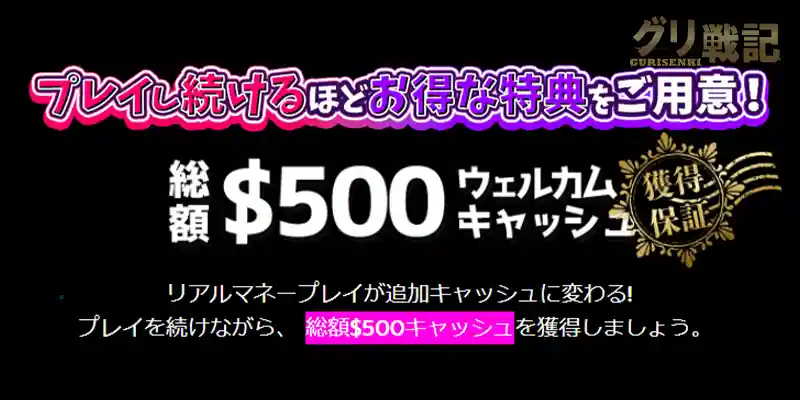 2020年に大幅リニューアルしたオンラインカジノで、初回入金ボーナス最大$500のウェルカムキャッシュバックが用意されています。