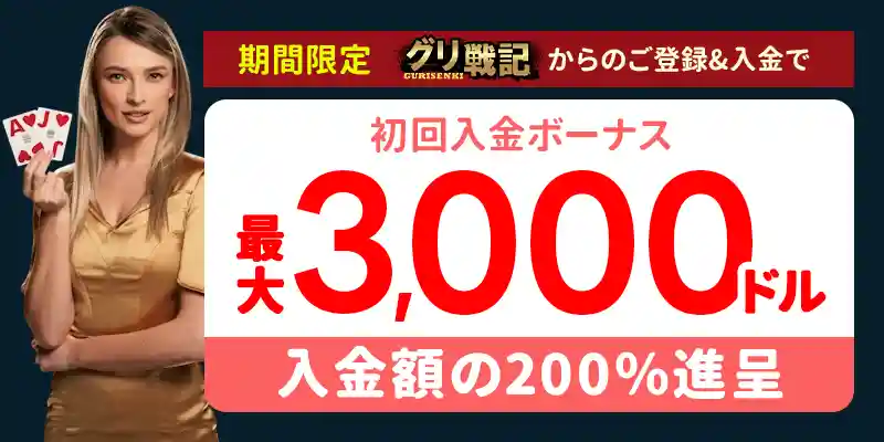 当サイト限定・初回入金ボーナス最大$3000の200%ボーナスを用意しました。