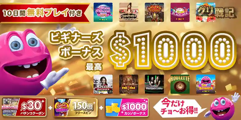 | 1回目 | スロットボーナス最大5万円(100%)orライブカジノ最大2万5000円(100%)スピンクレジット$1500(100%)+ Moonprincessのフリースピン100回 |