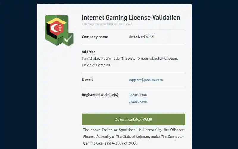 Pazuru.comはコモロ連合自治州アンジュアン島政府によってライセンスされ、規制され、ライセンス番号:ALSI-152312015-F13のもとで運営されています。