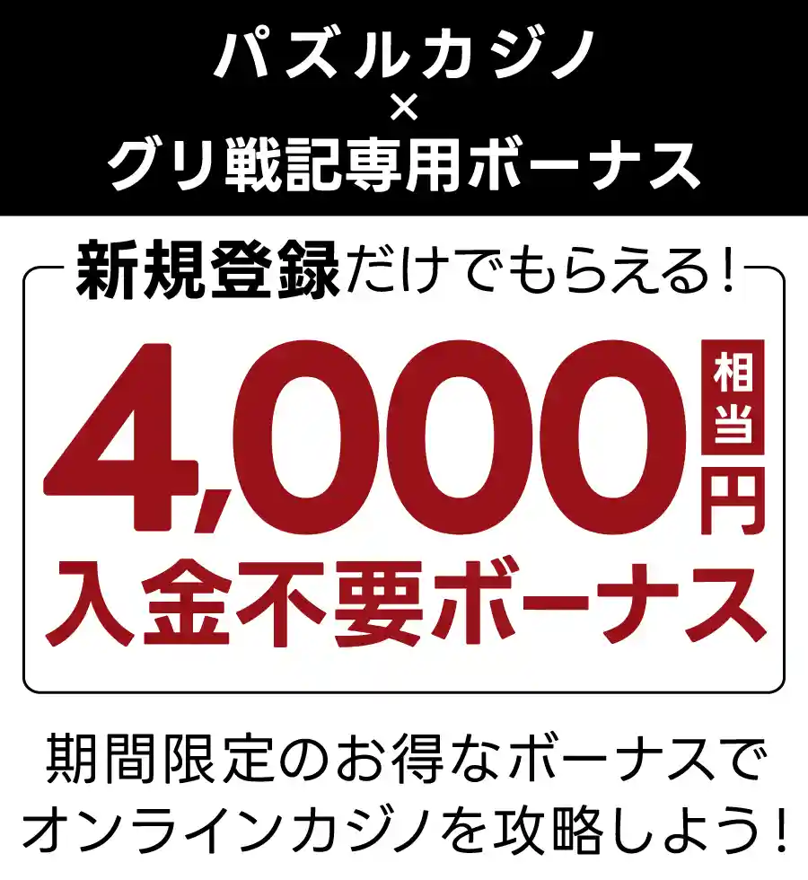 中でも、当グリ戦記だけの入金不要ボーナス20ドルは、カジノに登録するだけで貰えるというヤバすぎるボーナスです。この記事では、そんなパズルカジノのプロモーションや評判・口コミ、人気ゲームなどをまとめて解説していきます。