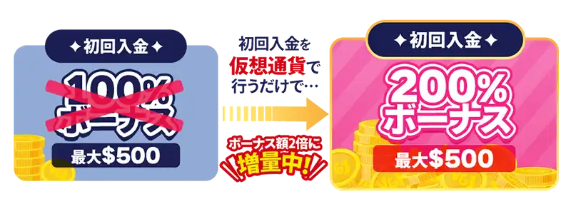- 仮想通貨で初回入金をすると、200%ボーナスが最大$500まで増量される。