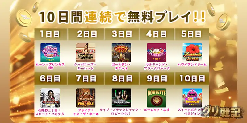 10日間連続で人気ゲームの日替わり無料プレイももらえる!