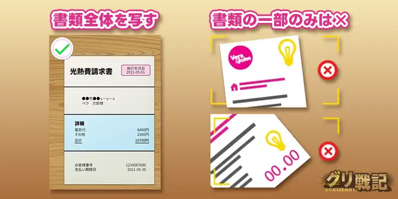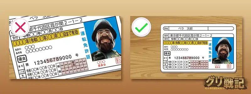 本人確認書類を撮影する際は、書類全体が写真内に入るよう四つ角が含まれるように撮影しましょう。また反射して文字の一部が読めないなどが無いよう気を付けて撮影してください。