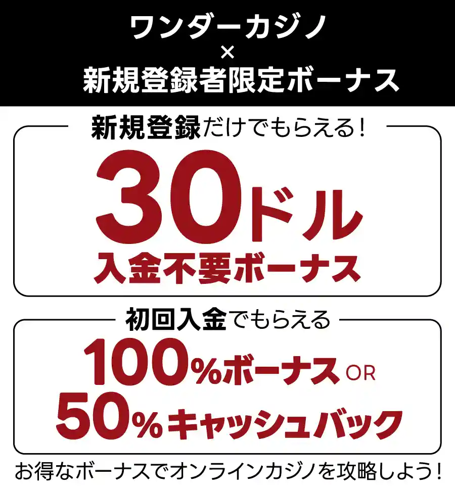 また、今なら当サイトからの新規登録で4,500円相当の入金不要ボーナスがもらえたり、豪華な初回入金ボーナスがゲットできたりと超お得!ワンダーカジノをお得に楽しみたいなら今が大大大チャンスです!