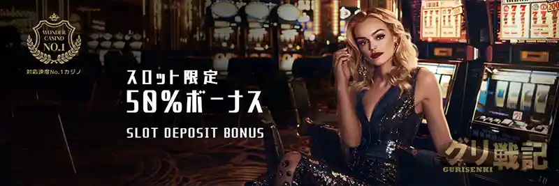 初回入金ボーナス以外にも、ワンダーカジノには常設のプロモーションがたくさんあります。その中でも人気なのが、VIP2以上のプレイヤーさんが利用できる「スロット限定50%ボーナス」です。