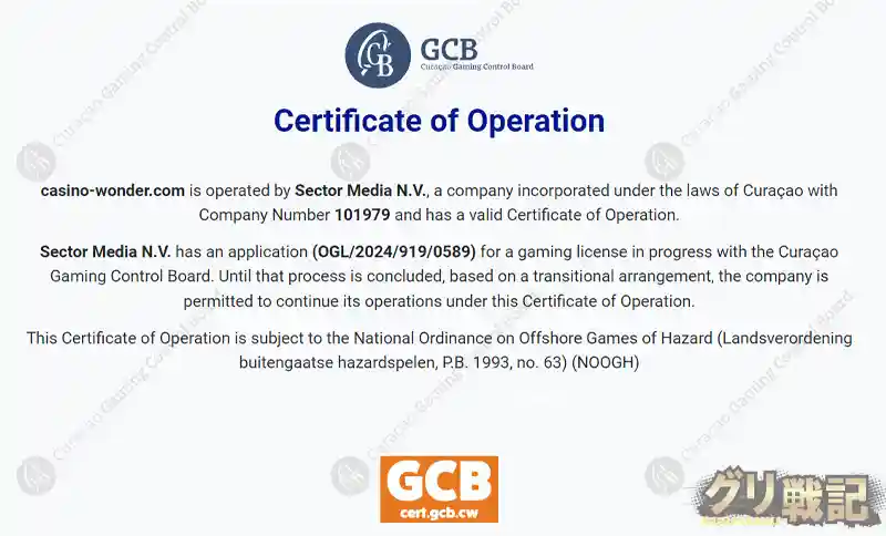 casino-wonder.comは、キュラソーの法律に基づいて設立され、会社番号101979を持ち、有効な運営証明書を持つSector Media NVによって運営されています 。