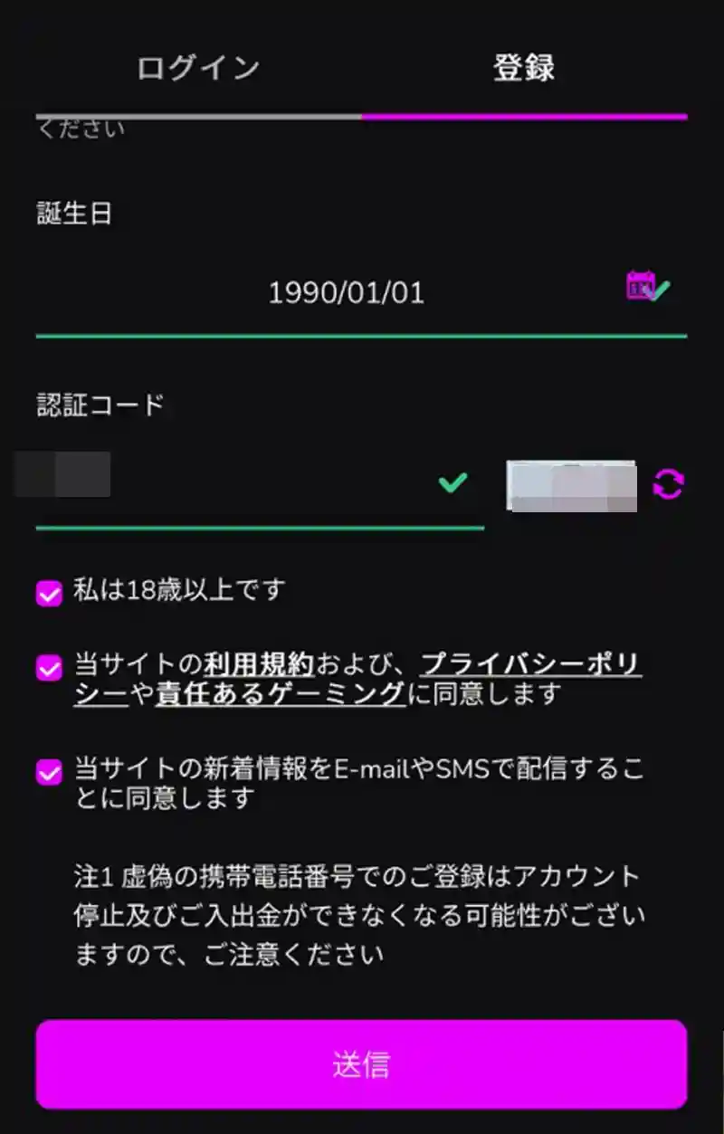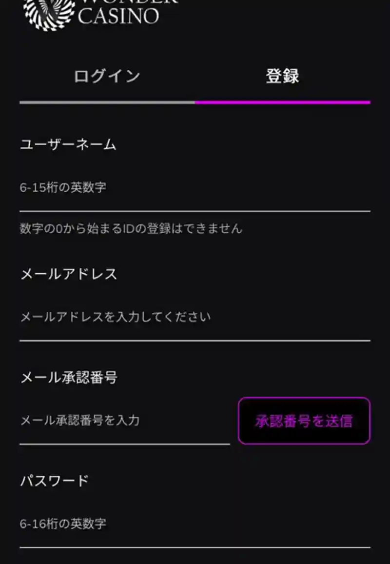 上記オレンジ色の「ワンダーカジノに登録する」をタップして公式サイトに移動。 画面下部にある「登録」をタップする。